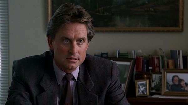 Sin embargo, este aspecto de luz natural no está realizado, ni de lejos, con luz natural. Para conseguir esa textura super suave y sedosa de la iluminación (que hace maravillas sobre los rostros de Close y Douglas), los cineastas, forzosamente, tuvieron que recurrir a unidades de iluminación muy grandes, ubicando y colocando cuidadosamente múltiples capas de material difusor para conseguir dicha suavidad. Lógicamente, a cada capa de difusión, rebote de luz, etc. se pierde mucha intensidad de las fuentes originales, por lo que es seguro que Atherton partió de los aparatos más grandes disponibles en aquél momento. Luego, además, bajo el mismo concepto, justifica a las mil maravillas su luz de interiores, colocando algunas fuentes integradas en el plano pero expandiéndolas a través de sedas, paneles para rebotar la luz, etc. de modo que parece que la luz procede de las lámparas que vemos en pantalla, aunque sus efectos suaves y contrastados forzosamente implican el uso de fuentes mucho más grandes y más suaves al límite de cuadro. El contraste siempre es elevado, pero gracias a toda esta difusión empleada en los aparatos de luz, las transiciones siempre son suaves y sutiles, algo seguramente apoyado circunstancialmente por un poco de humo en el decorado y favorecido por el uso de teleobjetivos y zooms como focal variable como método general de rodaje.