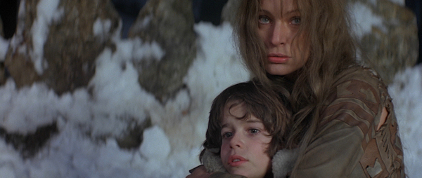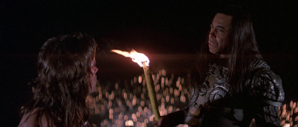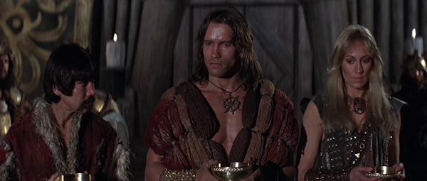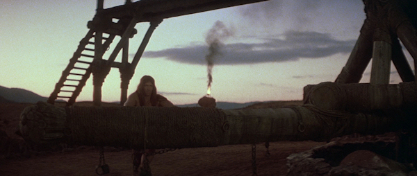 El problema principal aparece en los interiores, porque están rodados en formato anamórfico con niveles de luz muy bajos, recurriendo y confiando demasiado en el revelado forzado e incluso en la posibilidad de subir la copia al positivar, de forma que gran parte de los mismos –aunque también hay exteriores subexpuestos- tienen una enorme cantidad de grano, negros muy poco densos y sombras muy sucias. Además, la iluminación de los interiores, o incluso de los exteriores nocturnos al anochecer o en noche cerrada, con antorchas, fuegos, hogueras, etc. tampoco es demasiado inspirada, casi siempre con luces muy duras que tratan de imitar la temperatura de color real del fuego, pero producen excesivas sombras y obtienen un aspecto general excesivamente plano, incluso cuando hay la suficiente luz para que la calidad de imagen sea algo más decente. Las lentes empleadas, las Todd-AO 35 High Speed (esencialmente idénticas a las Canon Xtal Express del J-D-C Scope, es decir, las Canon K35 convertidas a formato anamórfico) muestran también, así mismo, un buen número de aberraciones y distorsiones, especialmente a grandes aperturas de diafragma como en la escena final en Thulsa Doom, aunque curiosamente ello también permite a Callaghan utilizar niveles de luz inferiores y hacer que, por una vez, el fuego que aparece en pantalla ilumine realmente las tomas.