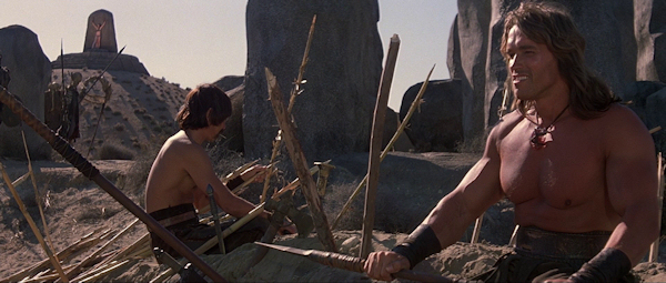 Adaptación para la gran pantalla de las aventuras del personaje creado por Robert E. Howard, producida por el italiano Dino de Laurentiis, que se inicia con Conan como niño presenciando la muerte de sus padres, su posterior esclavitud, en la que desarrolla su inmensa fortaleza física y continúa con sus ansias de venganza contra Thulsa Doom, el asesino de su familia. Rodada en vistosas localizaciones españolas (Ávila, Segovia, Cuenca, Granada y Almería), con guión firmado por Milius y Oliver Stone, lo mejor sin lugar a dudas de esta sinfonía de barbarie y violencia es la visceralidad con la que el director traslada el cómic a la pantalla, con un notable sentido épico y una brutalidad desaparecida desde hace mucho tiempo en el cine comercial. No obstante, en mitad de tanto embrutecimiento, Milius no sólo se permite tres o cuatro escenas brillantes (como la de apertura, las dos luchas contra los esbirros de Thulsa Doom o el final), sino que el film tiene extraños arranques líricos -aunque muy propios del autor de «The Wind and the Lion- que lo elevan notablemente con respecto a otras obras de su género, así como una conclusión que parece extraída de su propio libreto de «Apocalypse Now» y una banda sonora con un Basil Poledouris en estado de gracia.