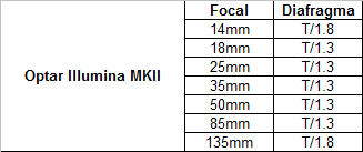 Las Illumina son la última creación del fabricante ruso que, en su día, manufacturó las famosas Lomo. Son un juego de ópticas ultraluminosas que van desde el 14mm hasta el 135mm y que, según sus especificaciones técnicas, cubren el formato 5K de la Red Epic sin ningún problema, con aperturas de T/1.3 en el juego principal 18-85mm. Sus diseños y mecanismos parecen claramente inspirados en los de las Zeiss Superspeed MKIII, en cuya comparación también se basa su marketing. Su tamaño es compacto y su peso medio ronda los 1300g, lo que las hace ideales para rodajes que requieran equipos ligeros. Pero su precio es algo elevado si se tiene en cuenta que, por el mismo, pueden adquirirse de segunda mano juegos de Zeiss Superspeed MKII, que cuentan a su favor con su probado rendimiento y prestigio del fabricante alemán. Porque el principal problema de las Illumina (que acaban de estrenar su versión MKII) parece que radica en su fiabilidad; aunque muchos operadores poseedores de las mismas las comparan ópticamente con las Zeiss –si bien reconocen que sus elementos mecánicos y presentación son inferiores-, algunas pruebas demuestran unas tremendas aberraciones cromáticas, alteraciones de color, falta de nitidez, bajísimo contraste e inconsistencias hasta prácticamente T/4.0, con especial incidencia en focales como el 18mm, de modo que su utilización precisamente en las aperturas más atractivas que ofrecen (más abiertas de T/2.0) queda muy comprometida. Por tanto, podría tratarse de una falta de rigor en su construcción que provoque que determinados juegos contengan serios defectos, o bien que todos contienen esas aberraciones tan serias pero, en cualquier caso, si se puede encontrar un juego conviene probarlo muy bien antes de lanzarse a rodar con el mismo. A no ser que lo que se pretenda, precisamente, sea explotar sus defectos.