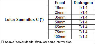 En el 2011, el prestigioso fabricante Leica comenzó las entregas de su última creación, un juego de ópticas cinematográficas de alta gama, destinadas a competir directamente con las Arri/Zeiss Master Prime y las Cooke 5/i. Con una amplia gama de focales que van desde el 16mm hasta el 100mm, con perspectivas de crecer próximamente tanto por arriba como por abajo, se trata además de unas ópticas de peso (1600g) y tamaño muy compacto, con una apertura constante de T/1.4, lo que asegura su eficiencia en condiciones de luminosidad escasas. La corrección de color, consistencia entre focales y ausencia de aberraciones están a la altura de lo que se espera para unos diseños cuyo precio de venta también compite de forma directa con el tope de gama de Zeiss y Cooke, en el entorno de los 20.000 euros por focal. Estéticamente, la imagen que proporcionan cubre el hueco existente entre las creaciones de estos dos fabricantes, puesto que las Summilux-C ni son tan contrastadas ni nítidas como unas Master Prime, pero su apariencia también es superior al contraste y nitidez que ofrecen las Cooke 5/i. Pero quizá, como indicábamos, si puede asumirse su inmenso coste de compra o alquiler, quizá su mayor ventaja sea su reducido tamaño y escaso peso, dadas sus tremendas prestaciones.