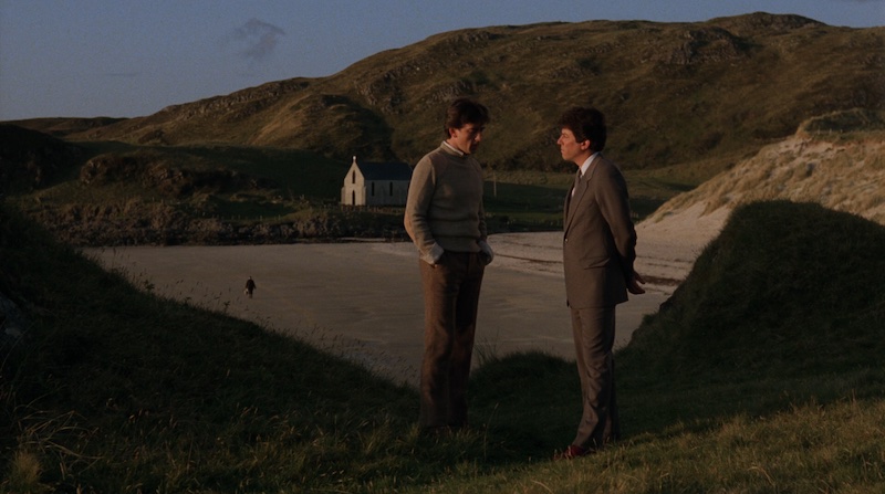 El estilo de Chris Menges es siempre identificable, tanto por su uso de la luz natural y rodajes con niveles de luz muy bajos, como por su dominio tanto de los exteriores como -curiosamente, porque muchas veces parece que destacan más sus memorables exteriores- sobre todo por ser un extraordinario director de fotografía de interiores, que es la circunstancia en la que siempre destaca aún más: es muy claro que algunos de sus exteriores en “Local Hero” son absolutamente portentosos, empleando la hora mágica y la orientación oeste de una playa muy al norte de Escocia (en la que seguramente esa hora mágica duraría mucho, puede que horas, a comienzos del verano de 1982), pero como en las citadas “The Killing Fields” o “The Mission”, los interiores de Menges tampoco se quedan atrás. En esa época se produjo justo la transición entre las clásicas emulsiones de 100 ASA y las nuevas (primero Fuji, luego Kodak) de 250 ASA, pero es probable que Menges no tuviera acceso aún a las mismas. A lo que sí que tuvo acceso es a su propio juego de lentes Zeiss High Speed o T1.4 “B Speeds”, con iris triangular, que le permitían rodar interiores muy abierto de diafragma o esos gloriosos exteriores en la hora mágica.