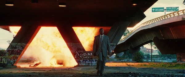 En cuanto a la luz y sobre todo, el color, que como decíamos ha perdurado mucho en el cine de las dos últimas décadas, “Man on Fire” destaca por el uso de dos tonalidades muy evidentes: el cián, que impregna toda la proyección (muchas escenas poseen esta dominante de color, incluyendo las noches, por el empleo de gelatinas en sus HMI, pero también muchas de las escenas diurnas en México) y, también, el uso del color verde, que también estaba presente en “Cidade Deus” -y que seguramente derive también del cine de acción asiático de los 90, que lo usaba-. De hecho, el verde tiene una doble vertiente, tanto porque aparecen fuentes de luz que generan esa luz en cuadro, de un lado, y de otro, porque en seguramente en la corrección de color digital se introdujo mucho viraje hacia ese tipo de tonos. También hay a lo largo de la película bastantes filtros degradados, e incluso cielos fuertemente polarizados, algo aparente en la recta final, aunque con el etalonaje digital es dificil saber a ciencia cierta qué parte pertenece al rodaje y qué parte fue ya generada en post-producción, como seguramente se ejecutarían este tipo de efectos a día de hoy. Curiosamente, la iluminación de Paul Cameron, cuando no recurre a fuentes de iluminación de tipo industrial, es más bien natural (por ejemplo, en la habitación de Creasy, o algunos interiores de la casa -con mezclas de colores fríos y cálidos- o de otras estancias) pero con tanta estilización en el color y en la puesta en escena, el efecto queda prácticamente inadvertido entre todas esas técnicas.