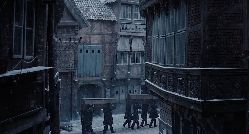 Los resultados exponen, de algún modo, un gusto por lo (principalmente) artesanal que luce muy bien en pantalla. Como recreación de una época, cuando menos a nivel atmosférico (pues no se trata de una película realista), los resultados son magníficos, especialmente si se tiene en cuenta el esfuerzo que supone -a nivel de pruebas, pruebas, y más pruebas- y el riesgo que conlleva rodar escenas como las de la presente película en celuloide en lugar de, por ejemplo, una cámara digital moderna con sensibilidades superiores a los 2500 ASA. Aún así, ciertas elecciones de Blaschke, como la de utilizar el filtro que elimina el rojo en las escenas nocturnas, continúan produciendo un aspecto algo extraño, pero desde luego, no tan extraño como el de «The Northman». Y por supuesto, es muy interesante comprobar cómo dos cineastas van creciendo y mejorando (y complementándose) película a película. En «Nosferatu», además, recuperan la relación de aspecto clásica de 1.66:1, que proporciona el ancho necesario y mucha altura para componer adecuadamente un montón de planos largos y una puesta en escena elegante, con mucha simetría; elementos todos ellos que hacen del trabajo de Jarin Blaschke una de las grandes fotografías del año, conjugando mucha técnica y estilo en una película que ofrece mucho visualmente, por lo que parece plenamente justificado que, de momento, opte a todos los grandes premios del año.